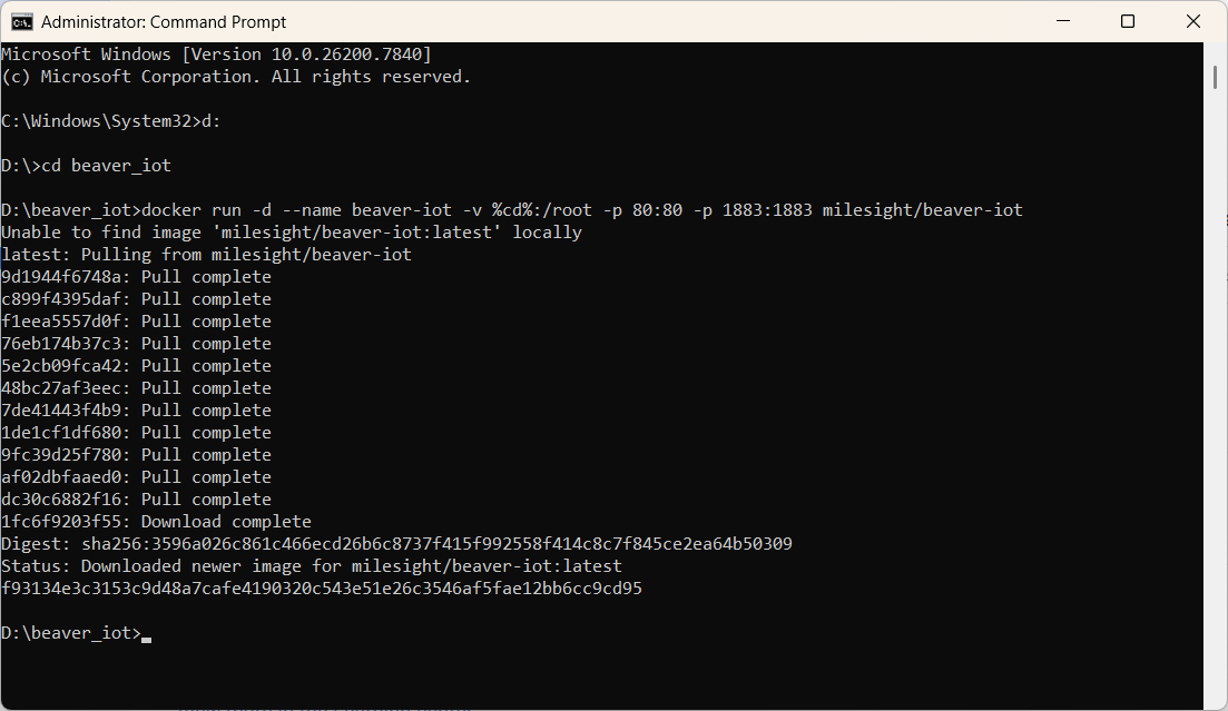 in brief, first we install docker desktop, i choose the default wsl and run the command docker run -d --name beaver-iot -v %cd%:/root -p 80:80 -p 1883:1883 milesight/beaver-iot